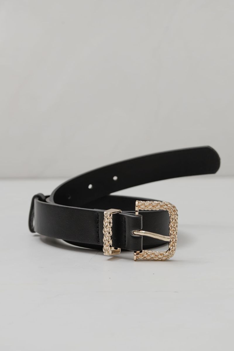 Cinto fino confeccionado em PU, modelo de cintura baixa, com fivela metalizada trançada. Um acessório delicado e elegante que adiciona um toque de sofisticação ao visual.