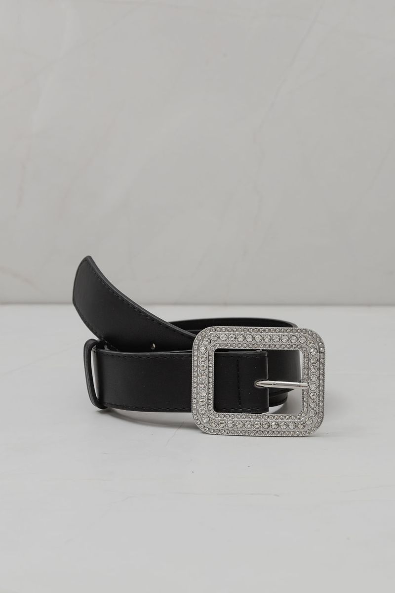 Cinto largo confeccionado em PU, modelo de cintura alta, com fivela quadrada cravejada com strass. Um acessório que traz sofisticação e um toque de brilho para destacar o visual.