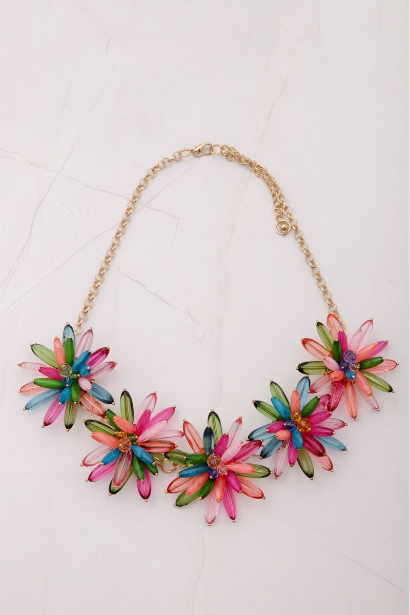 Colar metal dourado. Cristais coloridos em flores 3D, fechamento por lagosta. Acompanha caixinha quadrada com moldura polipropileno com push e fita stretch.