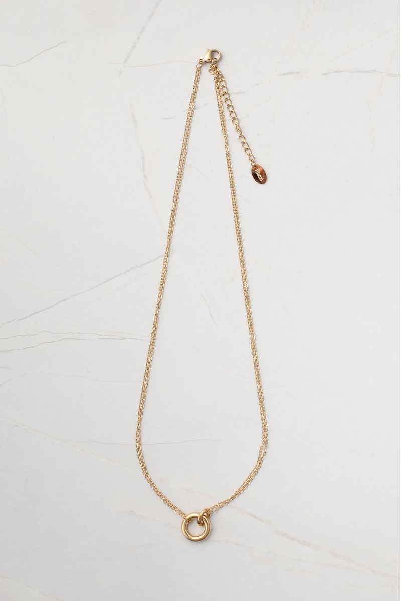 Colar em aço inoxidável banhado, com design delicado e toque moderno. Apresenta mix de correntes douradas e pingente de argola, com fecho de garra de lagosta. Acompanha uma caixinha com moldura em PVC e filme reforçado transparente, com encaixe push, ideal para presentear ou guardar com carinho.