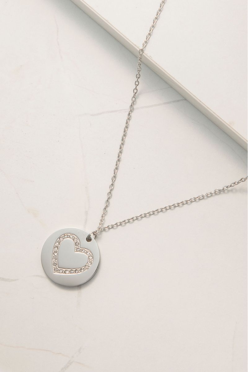 Colar metalizado, com corrente fina. Pingente redondo com aplicação de strass em formato de coração. fechamento por lagosta e níveis de ajuste com pingente Mamô.