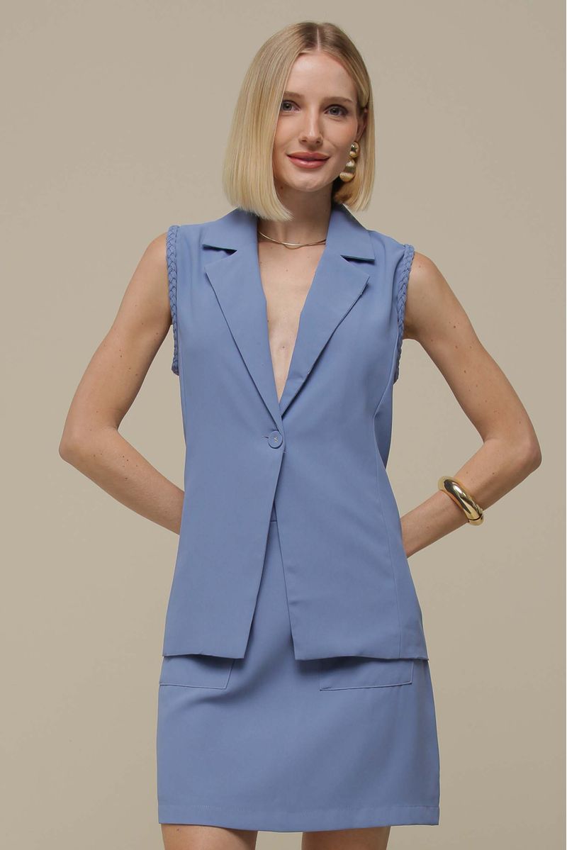 Colete alongado de alfaiataria, com alça larga e cava aplicada trançada, que adiciona um toque moderno e sofisticado à peça. O botão frontal forrado e o decote V com gola tradicional garantem um estilo clássico, enquanto a modelagem estruturada proporciona um visual elegante e contemporâneo.