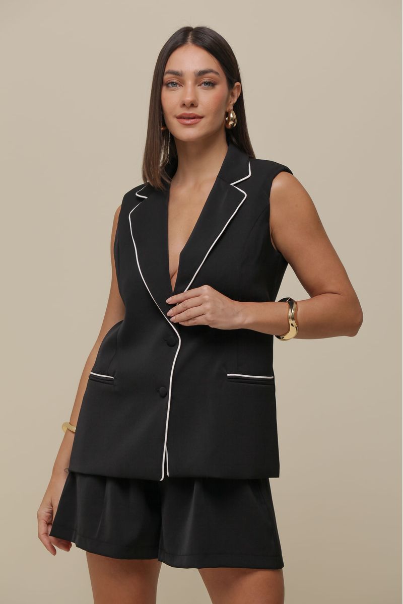 Colete em alfaiataria crepe bicolor, com ombreiras estruturadas e forro interno. Possui bolsos frontais, abotoamento frontal com botões forrados e alças largas, proporcionando um ajuste elegante e moderno.