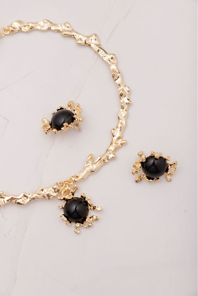 Conjunto colar e brinco, metal dourado. Gargantilha dourada em metal, com detalhes assimétricos, com pingente de pedra preta, fechamento T. Par de brincos com pedra preta e fechamento por tarraxa, acompanha caixinha quadrada com moldura polipropileno com push e fita stretch.