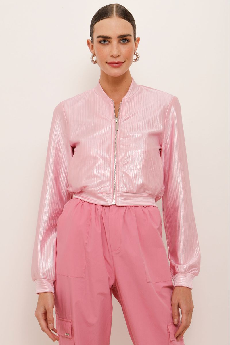 Jaqueta bomber plissada, confeccionada em crepe acetinado com revestimento metalizado. Bolsos e fechamento por zíper frontal, não possui forro.