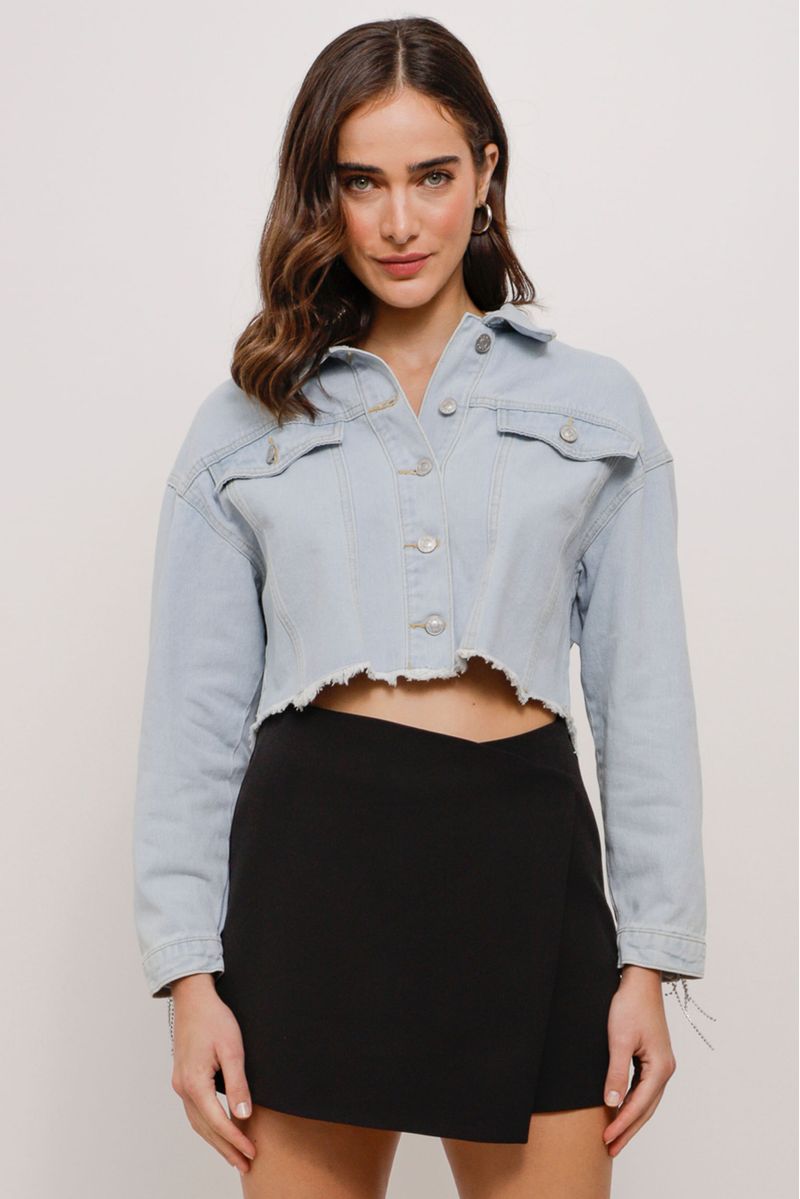 Jaqueta cropped jeans, modelagem ampla. Com franjas em strass na parte posterior e mangas. Possui barra desfiada, lapelas e abotoamento frontal.