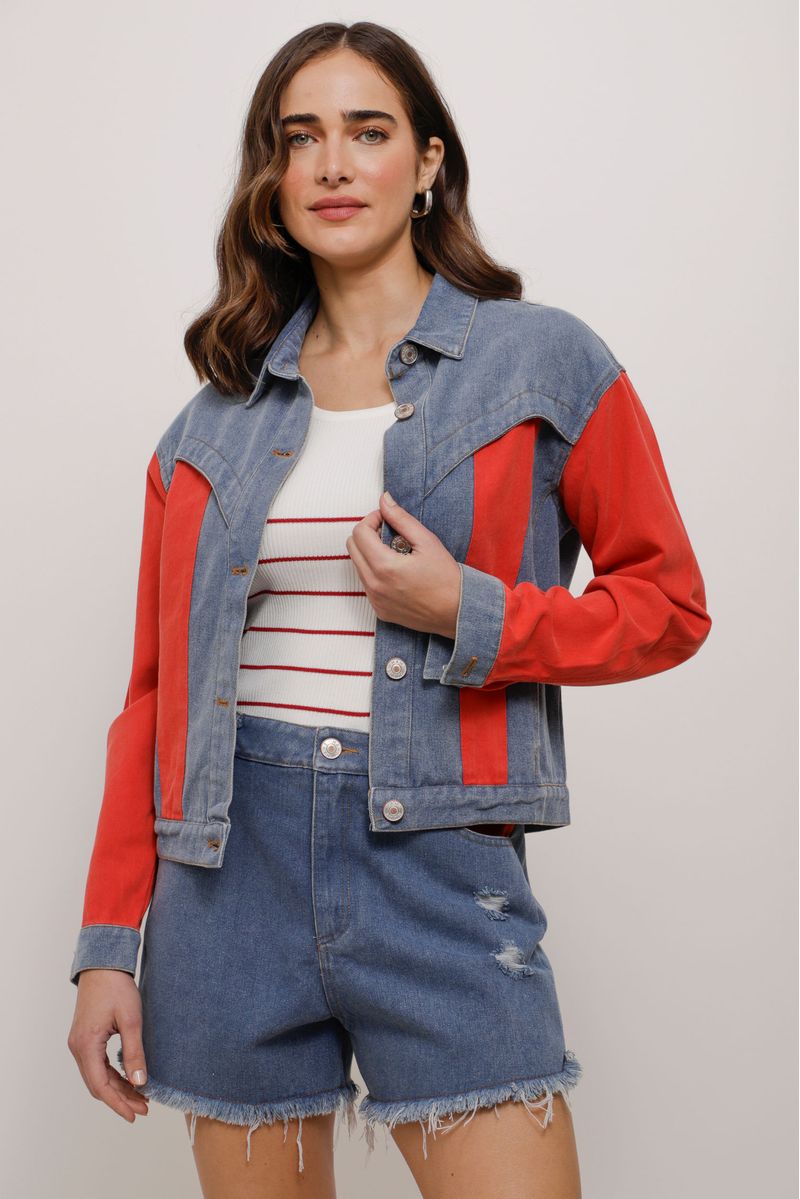 Jaqueta jeans com recortes em sarja color. Jeans levinho com abotoamento frontal e nos punhos.