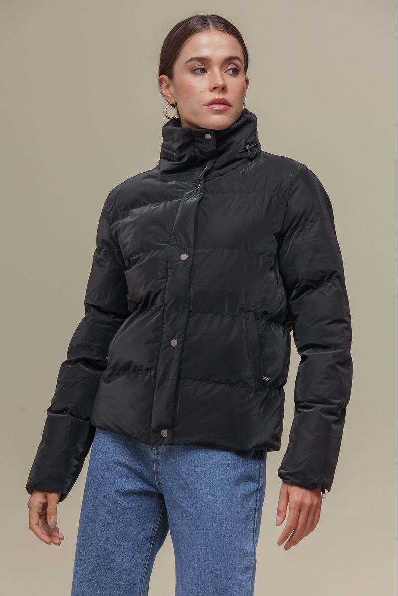 Jaqueta puffer estilo bomber, confeccionada em nylon com acabamento fosco. Conta com enchimento que garante aquecimento sem perder a leveza, além de forro interno acetinado para maior conforto. Possui bolsos frontais com zíper e fechamento duplo por zíper e botão de pressão, proporcionando praticidade e proteção extra contra o frio.