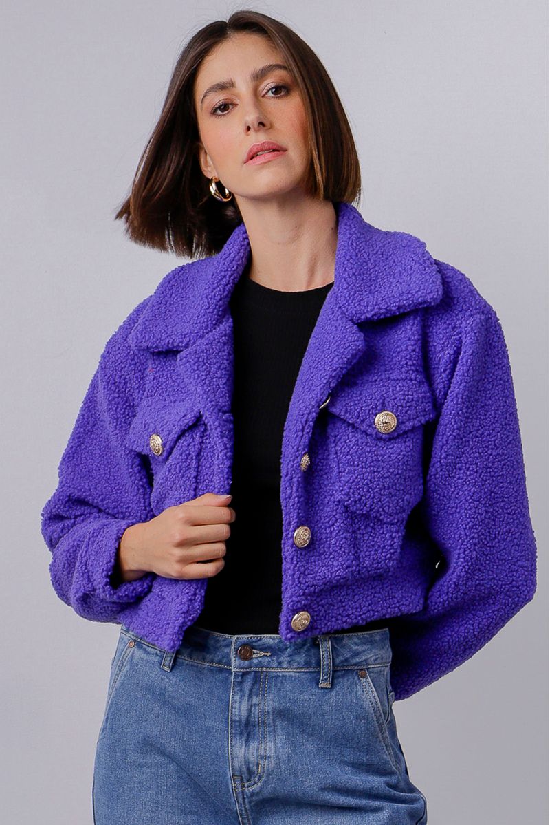 Jaqueta curta teddy ,tecido felpudo que lembra a lã de carneiro, botões dourados com brasão em alto-relevo, bolsos frontais com lapela, possui forro interno.
