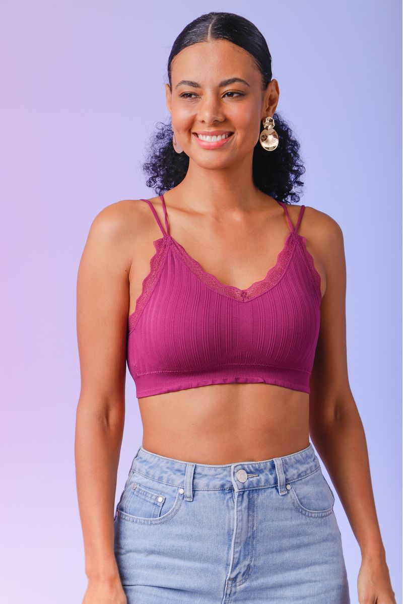 Kit Top com alça elastica dupla, cruzada nas costa, aplicação de renda, possui bojo.