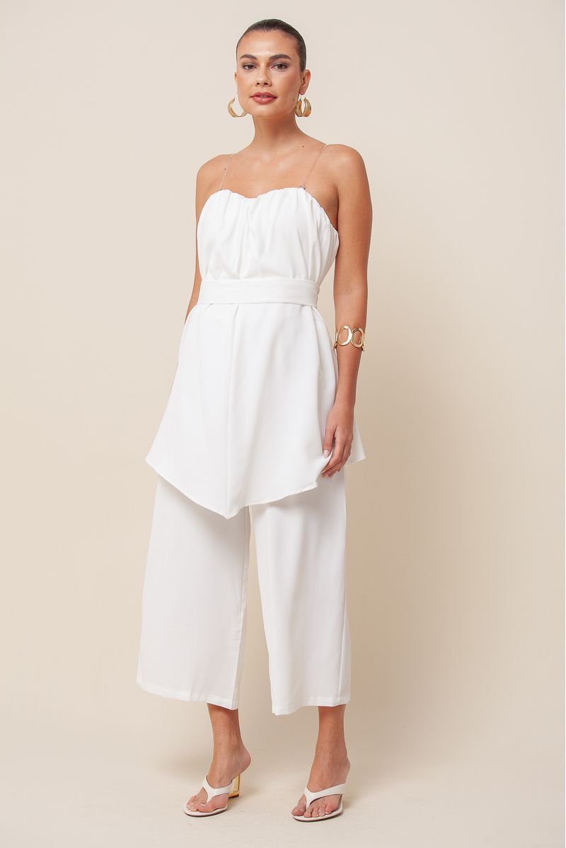 Combine este macacão com sandálias de salto alto e clutch minimalista para um visual sofisticado e moderno. A modelagem tomara que caia valoriza o colo, e a faixa ajustável realça a cintura, criando uma silhueta impecável. Aposte em brincos longos para finalizar o look com elegância.