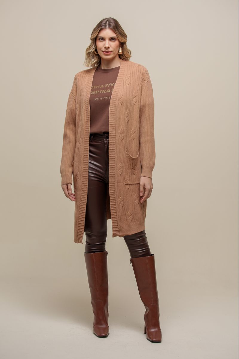Cardigan alongado em tricô com trama trabalhada, trazendo textura e sofisticação ao look. O modelo sem abotoamento frontal tem caimento leve e conta com bolsos funcionais, além de mangas longas para maior conforto nos dias frios.