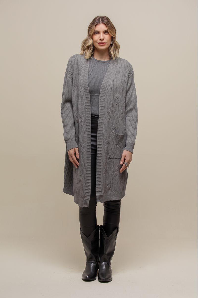 Cardigan alongado em tricô com trama trabalhada, trazendo textura e sofisticação ao look. O modelo sem abotoamento frontal tem caimento leve e conta com bolsos funcionais, além de mangas longas para maior conforto nos dias frios.