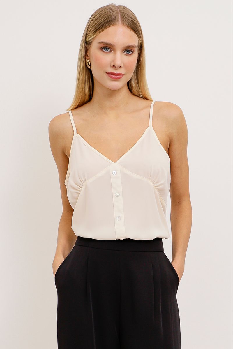 Regata confeccionada em georgette. Alças finas ajustáveis, decote V com franzido no busto e botões na parte frontal.
