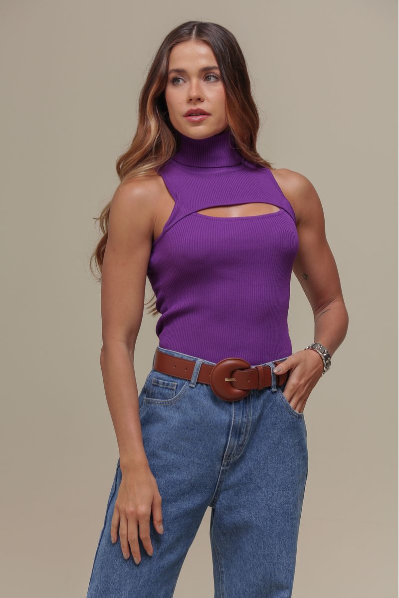 Regata em tricô canelado com modelagem ajustada e gola alta. Possui recorte frontal que adiciona um toque moderno ao visual.