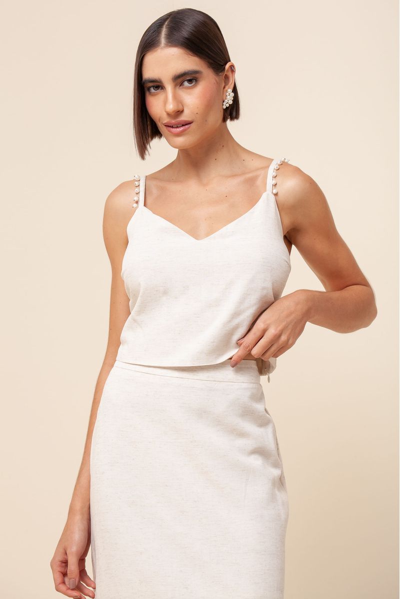 A Regata Cropped Detalhe Pérolas é confeccionada em material de alta qualidade, possui alças finas com detalhe em pérolas, decote elegante em V e forro interno.
