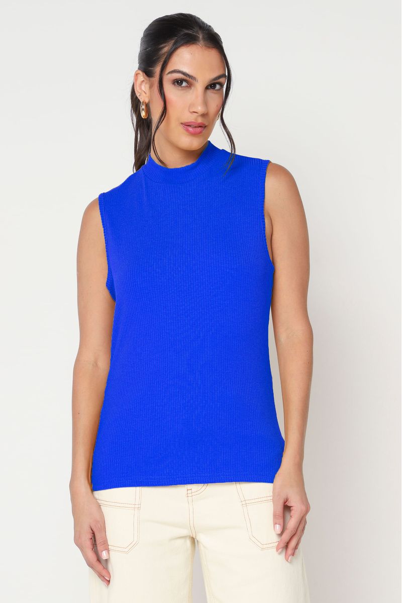 Regata canelada em malha. Possui gola alta e cava média.