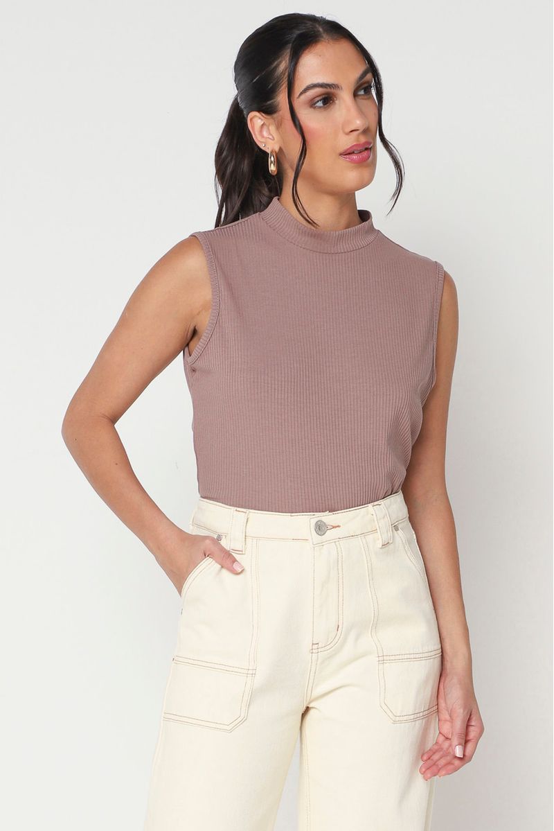 Regata canelada em malha. Possui gola alta e cava média.