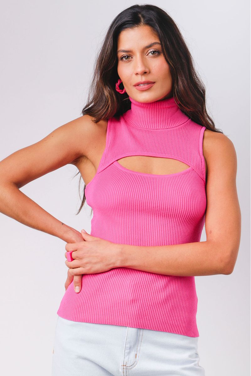 Regata gola alta, confeccionada tricot, alça larga e recorte no decote.