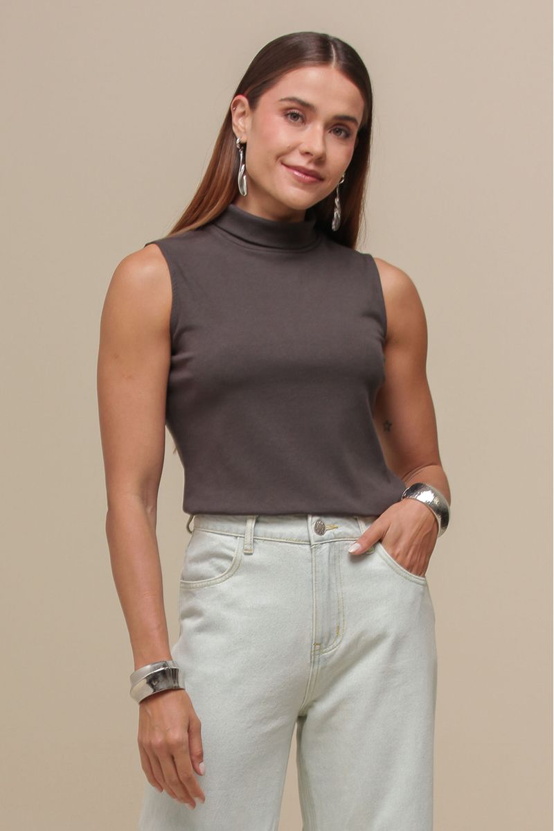 Regata ribana, alongada e ampla, com alças largas e gola alta. Apresenta pequenas fendas nas laterais, adicionando um toque de sofisticação ao design.