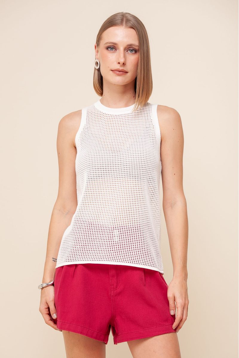 Regata em tricô vazado, com alças largas e gola careca, perfeita para adicionar um toque de frescor. A trama leve e arejada garante conforto e estilo, ideal para os dias mais quentes.