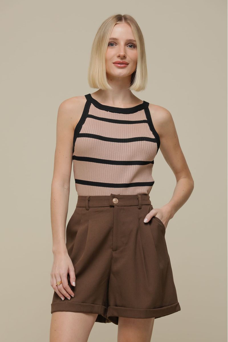 Regata curta em tricô canelado, com listras horizontais que conferem um toque moderno e descomplicado. Suas alças finas fixas e a cava americana trazem um estilo contemporâneo e feminino, ideal para a transição entre as estações. Leve e confortável, é perfeita para criar looks versáteis e cheios de personalidade.