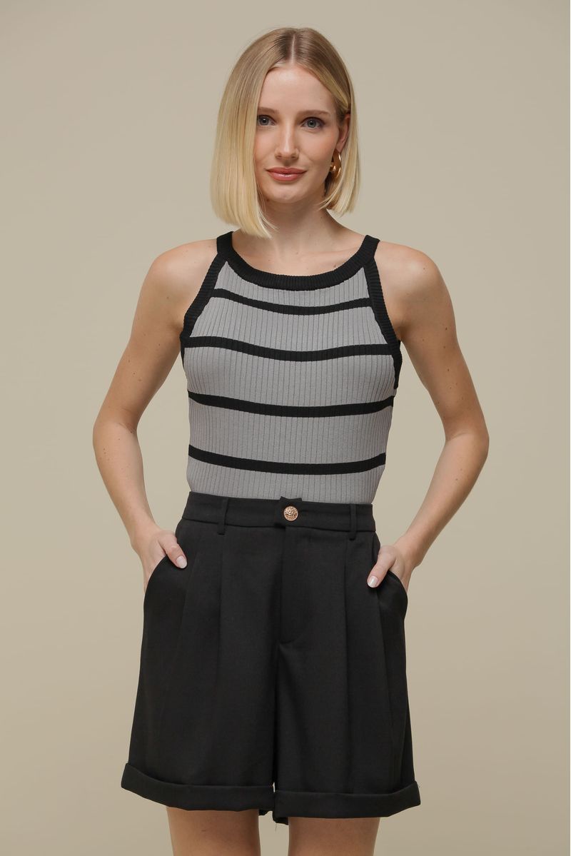 Regata curta em tricô canelado, com listras horizontais que conferem um toque moderno e descomplicado. Suas alças finas fixas e a cava americana trazem um estilo contemporâneo e feminino, ideal para a transição entre as estações. Leve e confortável, é perfeita para criar looks versáteis e cheios de personalidade.