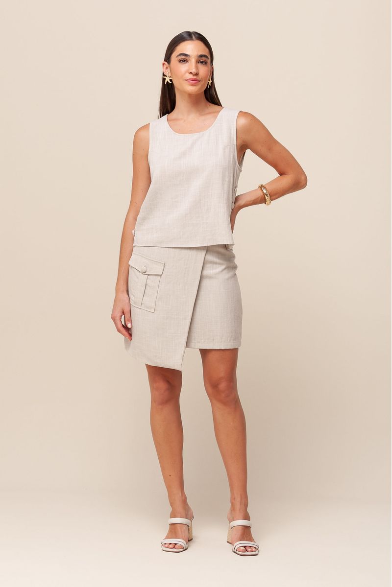 Saia curta em viscolinho, com detalhe transpassado na parte frontal e botão forrado, criando um visual moderno e descomplicado. Possui bolsos laterais e forro interno, oferecendo conforto e praticidade, com fechamento por zíper invisível na parte de trás.
