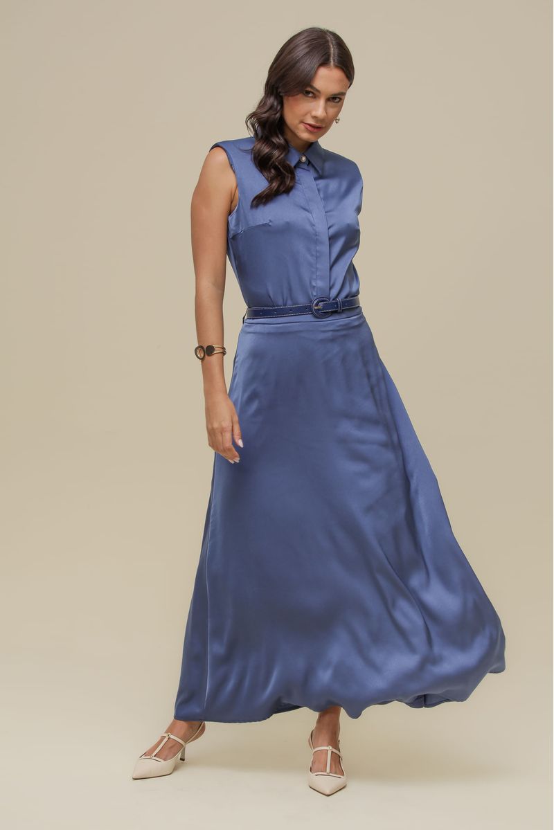 Saia midi em cetim de modelagem evasê e cintura alta. Possui passantes e acompanha cinto em PU na mesma cor da peça. Fechamento lateral por zíper invisível. O tecido acetinado confere leveza e um caimento sofisticado.