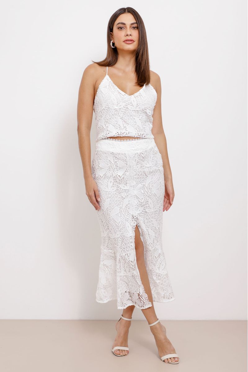 Saia Mídi, confeccionada em crochê com forro interno. Modelo sereia com barra godê, possui cós largo com renda trabalhada. Fenda frontal com renda e fechamento posterior por zíper invisível.