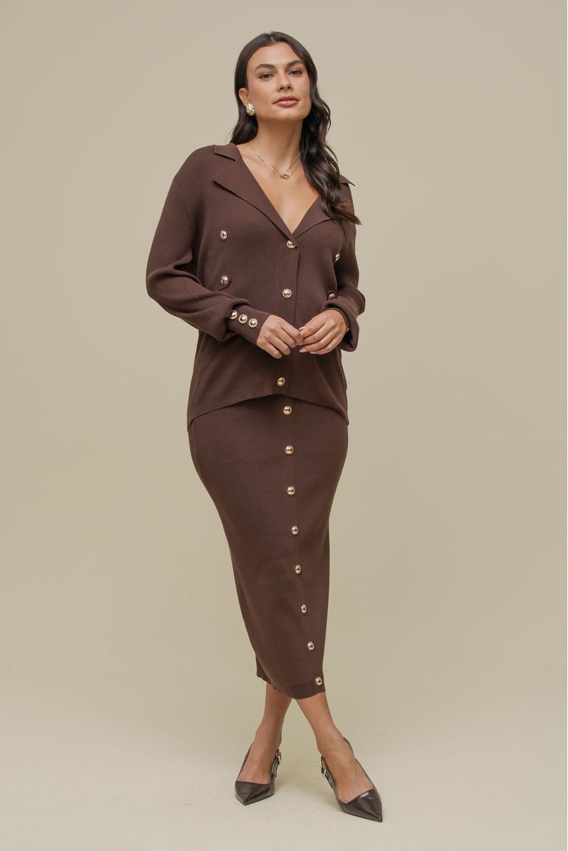 Saia midi em tricô texturizado, com modelagem ajustada e cós largo que valoriza a silhueta. Os botões dourados aplicados na parte frontal acrescentam um detalhe sofisticado, elevando o design da peça.