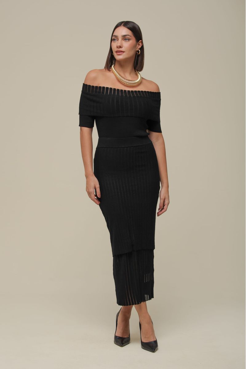 Saia midi reta em tricô, com cintura alta e cós largo para melhor ajuste. O design texturizado com tule adiciona sofisticação, enquanto a barra em camadas traz movimento à peça.