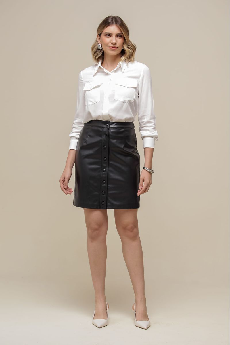 Saia curta confeccionada em PU, com cintura alta e abotoamento frontal forrado para um acabamento sofisticado. O forro interno garante conforto e caimento estruturado, realçando a elegância da peça.