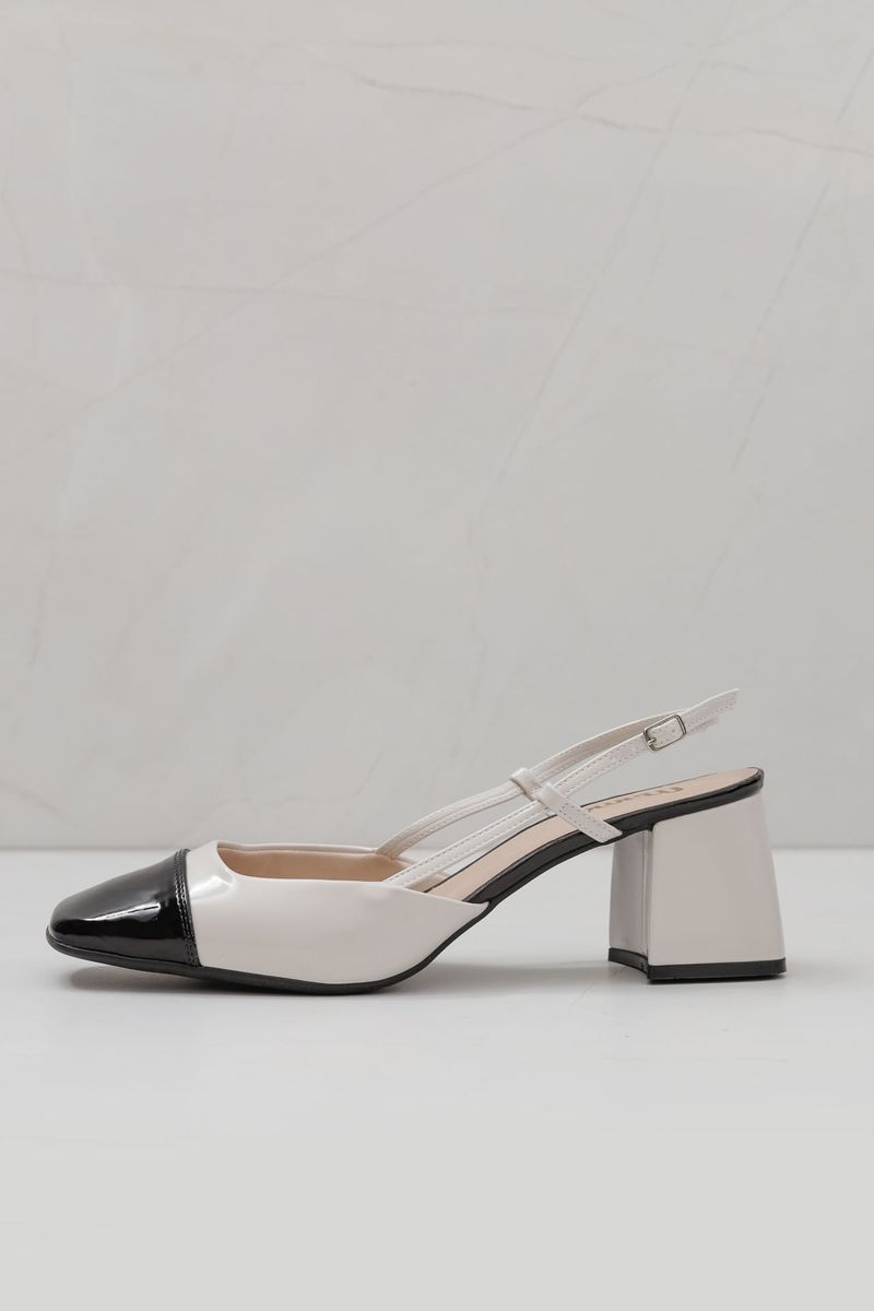 Sapato em PU com acabamento na parte frontal de formato quadrado e um toque de brilho, conferindo um charme especial ao design. Possui ajuste no calcanhar, salto bloco de 6,5 cm que garante estabilidade e uma palmilha confortável para uso prolongado.
