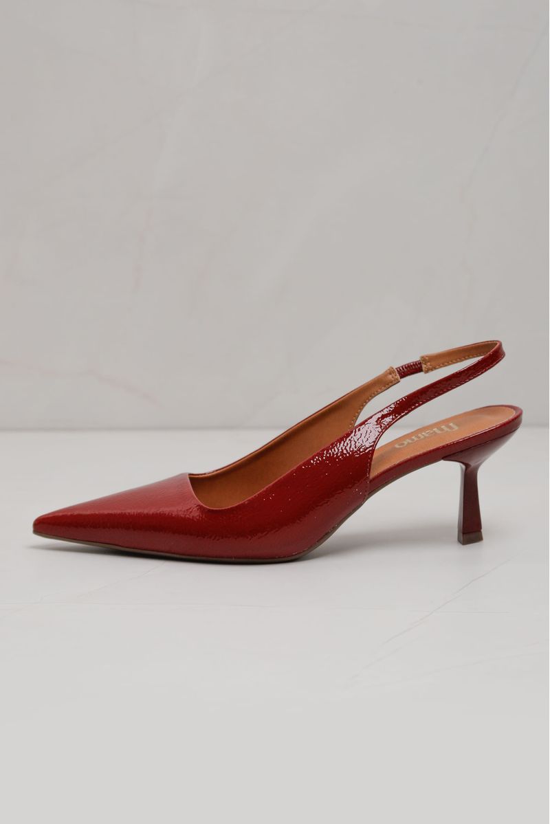 Scarpin slingback em material vernizado texturizado, com bico fino sofisticado. Correia ajustável com pequeno elástico para conforto e segurança ao caminhar. Sola emborrachada e salto pirâmide de 6cm, trazendo elegância e modernidade.