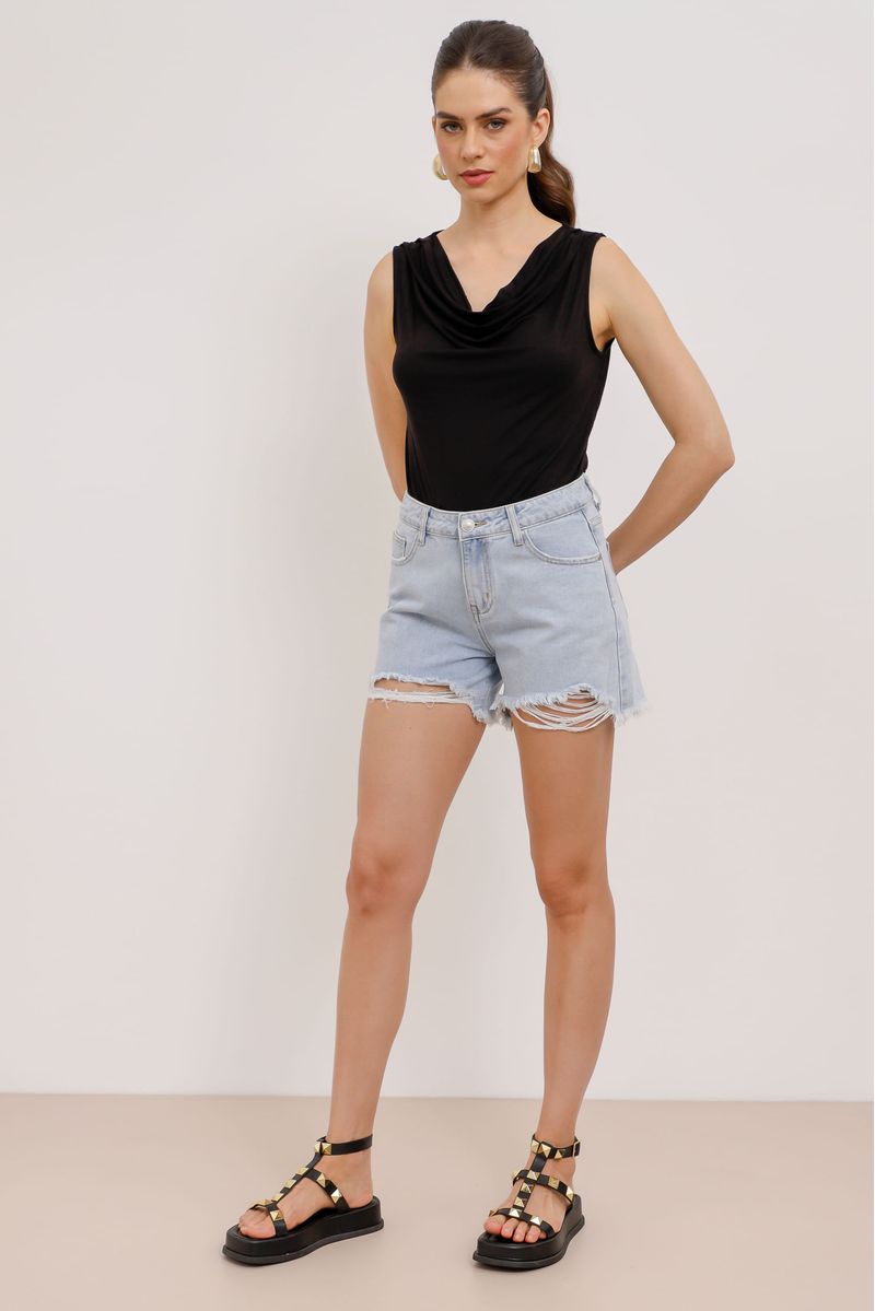 Short curto, confeccionado em jeans com a lavagem clara. Cintura alta com passador para cinto, fechamento por zíper e botão. Com bolsos frontais e posteriores, possui destroyed e barra desfiada.