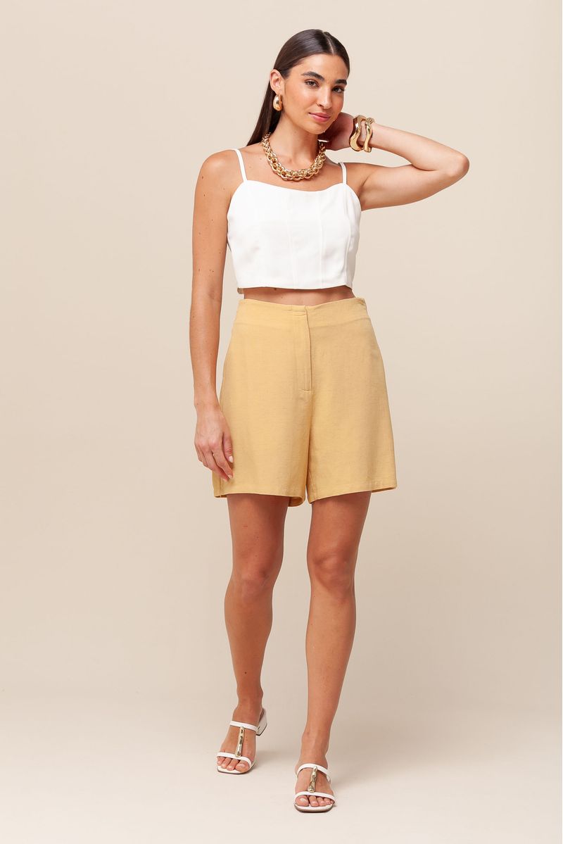 Short em linho, levinho e confortável, com cintura alta e forro interno para um toque extra de conforto. Design clean, sem cós e sem bolsos, com fechamento discreto por zíper invisível e gancho interno.