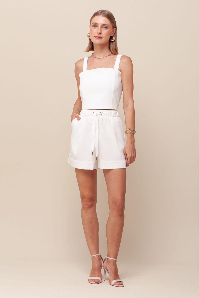 Short em crepe com modelagem de alfaiataria, comprimento curto e cintura alta com elástico e cordão ajustável, oferecendo conforto e estilo. Possui bolsos faca e design sem forro interno, ideal para dias mais quentes.