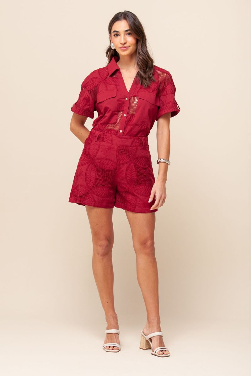 Short curto em guipir, projetado para garantir conforto e estilo. Com forro interno, a cintura alta e o cós largo proporcionam um ajuste perfeito e valorizam a silhueta. O passador para cinto permite privacidade no uso, enquanto o fechamento por zíper invisível na lateral mantém um visual limpo e elegante.