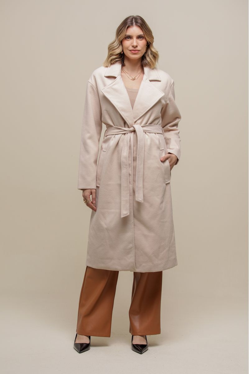 Sobretudo estruturado, confeccionado em lã batida, com forro acetinado para um caimento perfeito. O modelo acinturado valoriza a silhueta e conta com fechamento frontal por botão de pressão invisível. Possui bolsos funcionais e acompanha um cinto na mesma cor e material para ajuste ideal.