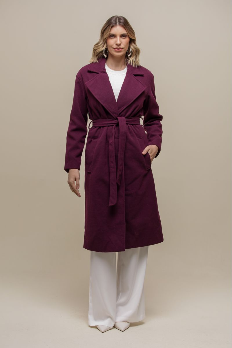 Sobretudo estruturado, confeccionado em lã batida, com forro acetinado para um caimento perfeito. O modelo acinturado valoriza a silhueta e conta com fechamento frontal por botão de pressão invisível. Possui bolsos funcionais e acompanha um cinto na mesma cor e material para ajuste ideal.
