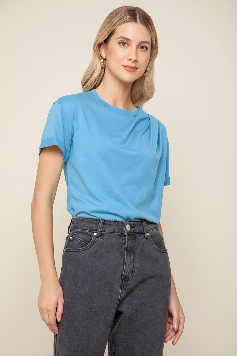 Camiseta de algodão 100%, confortável e durável. Apresenta gola redonda, com detalhes de pregas nos ombros, adicionando um toque de elegância ao design. As mangas são curtas, com barra dobrada, proporcionando um estilo casual e moderno.