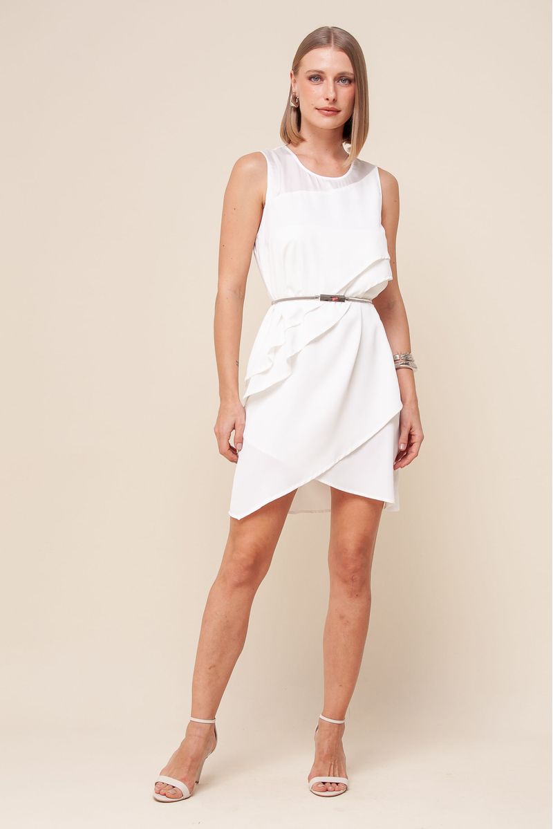 Vestido curto em crepe, leve e fluido, ideal para os dias quentes. Com alças largas e gola em formato U, que traz um detalhe acetinado. Os babados acrescentam movimento e frescor, enquanto o forro interno acoplado garante conforto. O botão na nuca proporciona um ajuste perfeito, e o cinto metalizado adiciona um toque sofisticado ao visual.