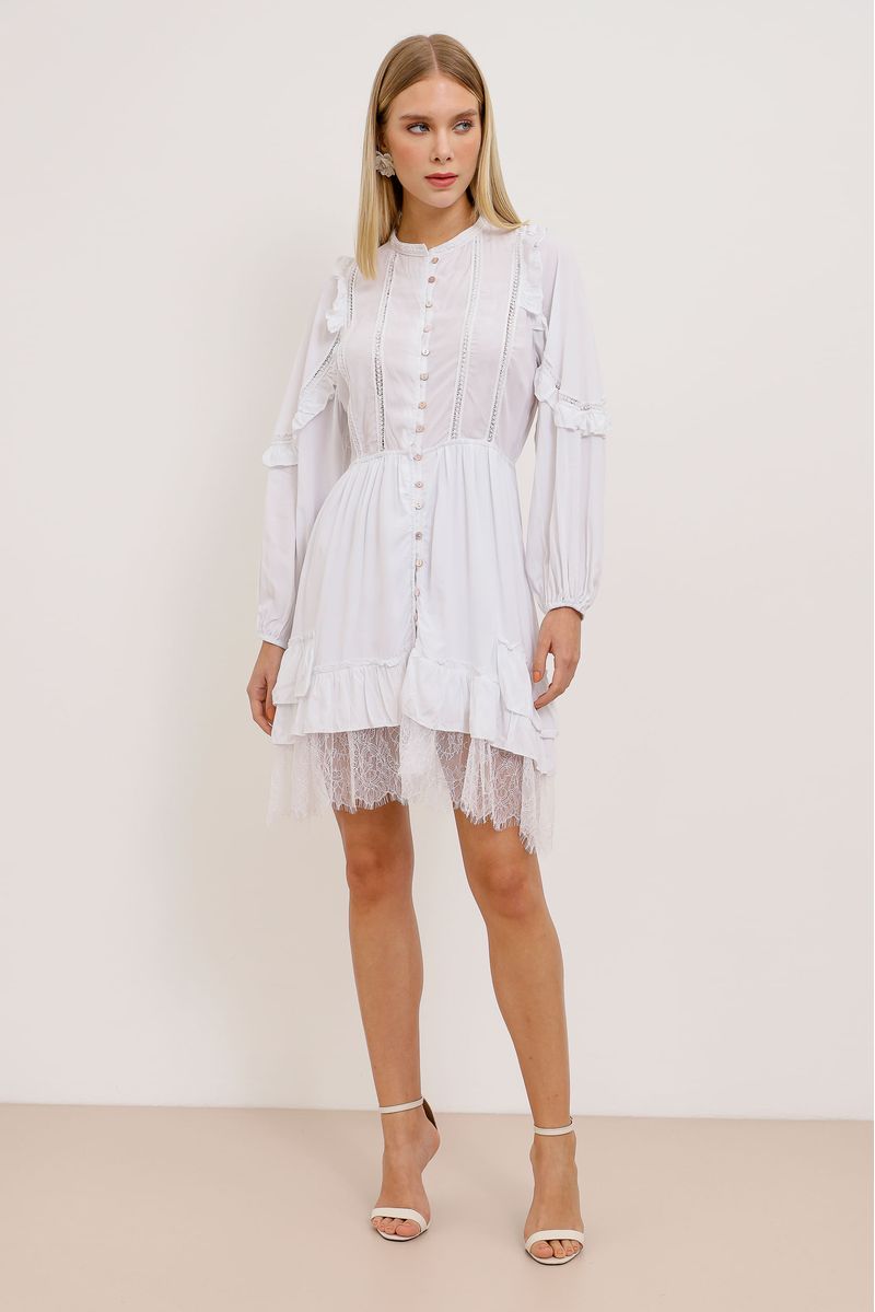 Vestido boho curto, confeccionado em viscose. Abotoamento frontal, babados nas barras e nas mangas com elástico nos punhos. Abotoamento e trama vazada na parte frontal, com renda na barra e forro interno.
