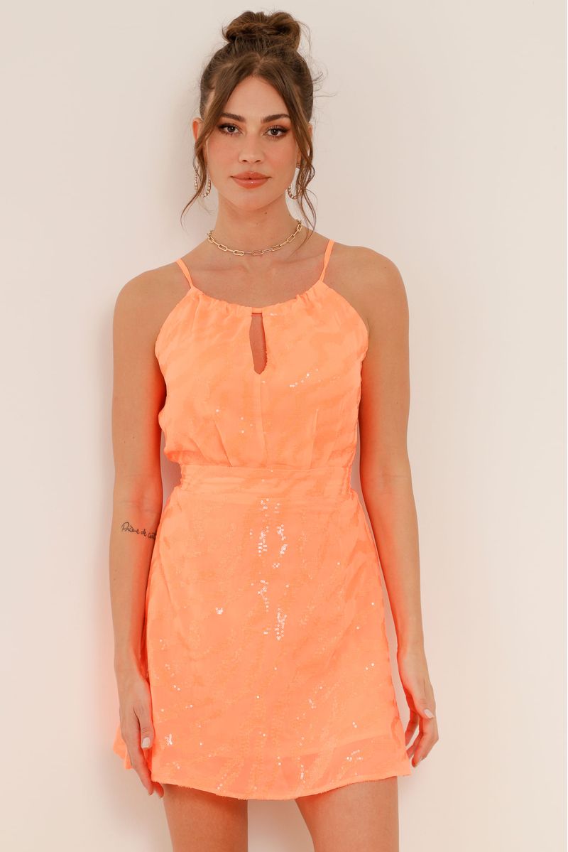 Vestido curto, confeccionado em chiffon, modelagem acinturada, detalhes em paetê transparente, possui forro, abertura nas costas, decote em gota com tiras para fechamento.