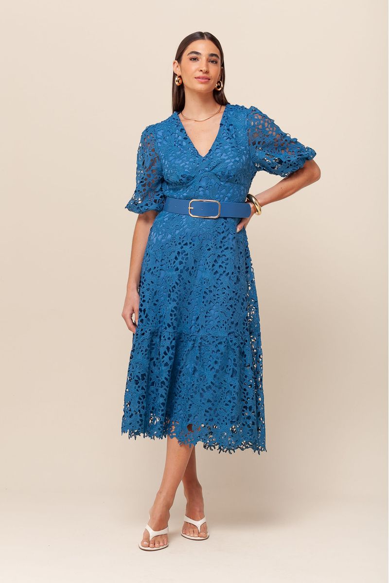 Vestido midi confeccionado em guipir delicado, com forro interno em viscose que proporciona conforto durante o uso. A manga curta em estilo balone, com forro em tule, traz um toque romântico e volumoso. O decote V e o babado na barra complementam o design sofisticado. O zíper invisível nas costas garante um ajuste perfeito, acompanha cinto em PU com fivela dourada que adiciona um detalhe moderno e elegante.