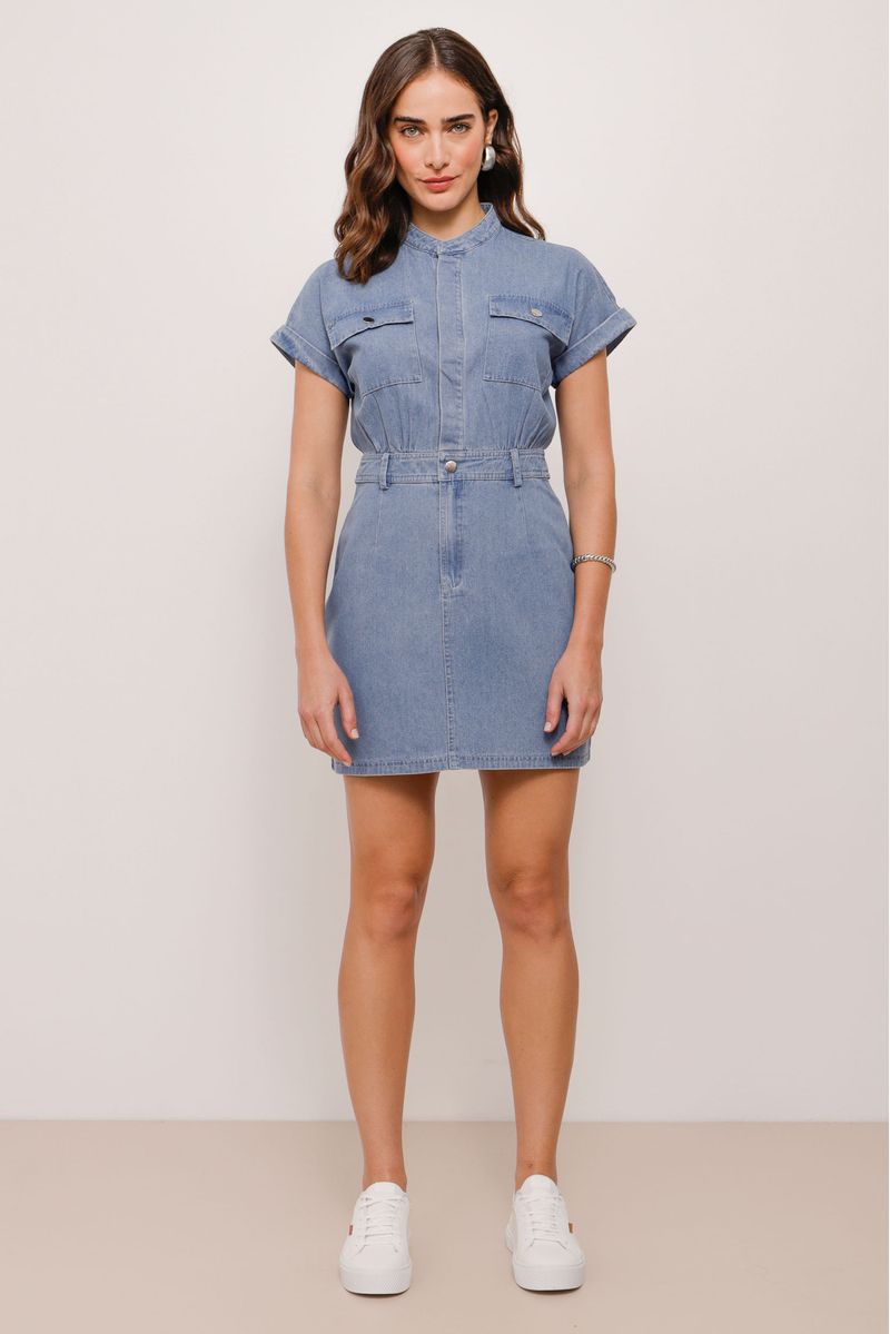 Vestido jeans curto acinturado sem elastano. Abotoamento frontal e zíper invisível, bolsos frontais com lapelas, possui passador para cinto e manga curta dobrada.