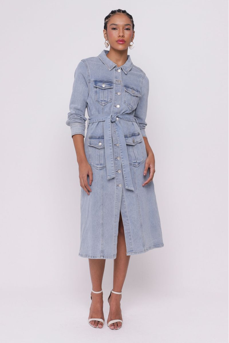 Vestido de comprimento mídi, confeccionado em jeans. Possui um cordão na cintura para um ajuste personalizado. Os bolsos utilitários com lapela na parte frontal proporcionam funcionalidade. Abotoamento frontal, manga longa com abotoamento nos punhos.