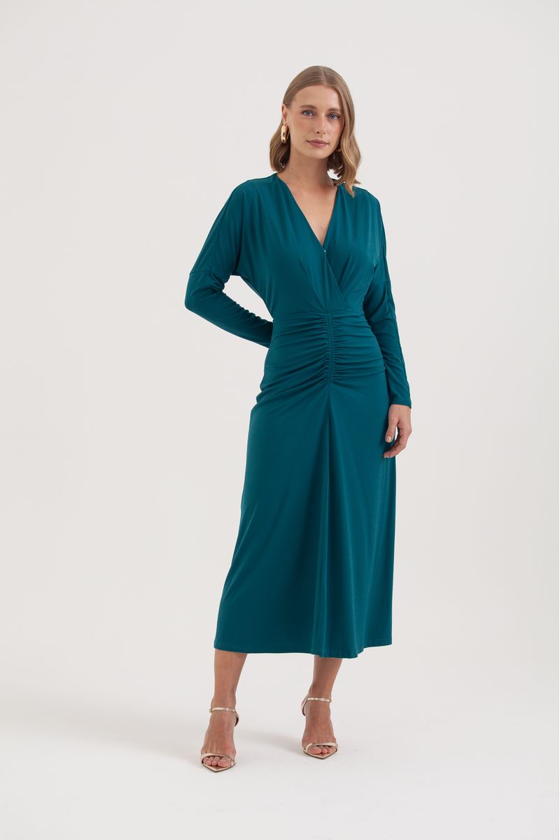 Vestido em jersei com caimento leve e modelagem que valoriza a silhueta. O decote V transpassado com prega adiciona delicadeza ao busto, enquanto o franzido com elástico na parte central frontal da saia confere um detalhe sofisticado e ajuste confortável. O zíper invisível lateral e o forro interno completam o acabamento refinado, resultando em uma peça elegante e feminina, ideal para produções com charme discreto.