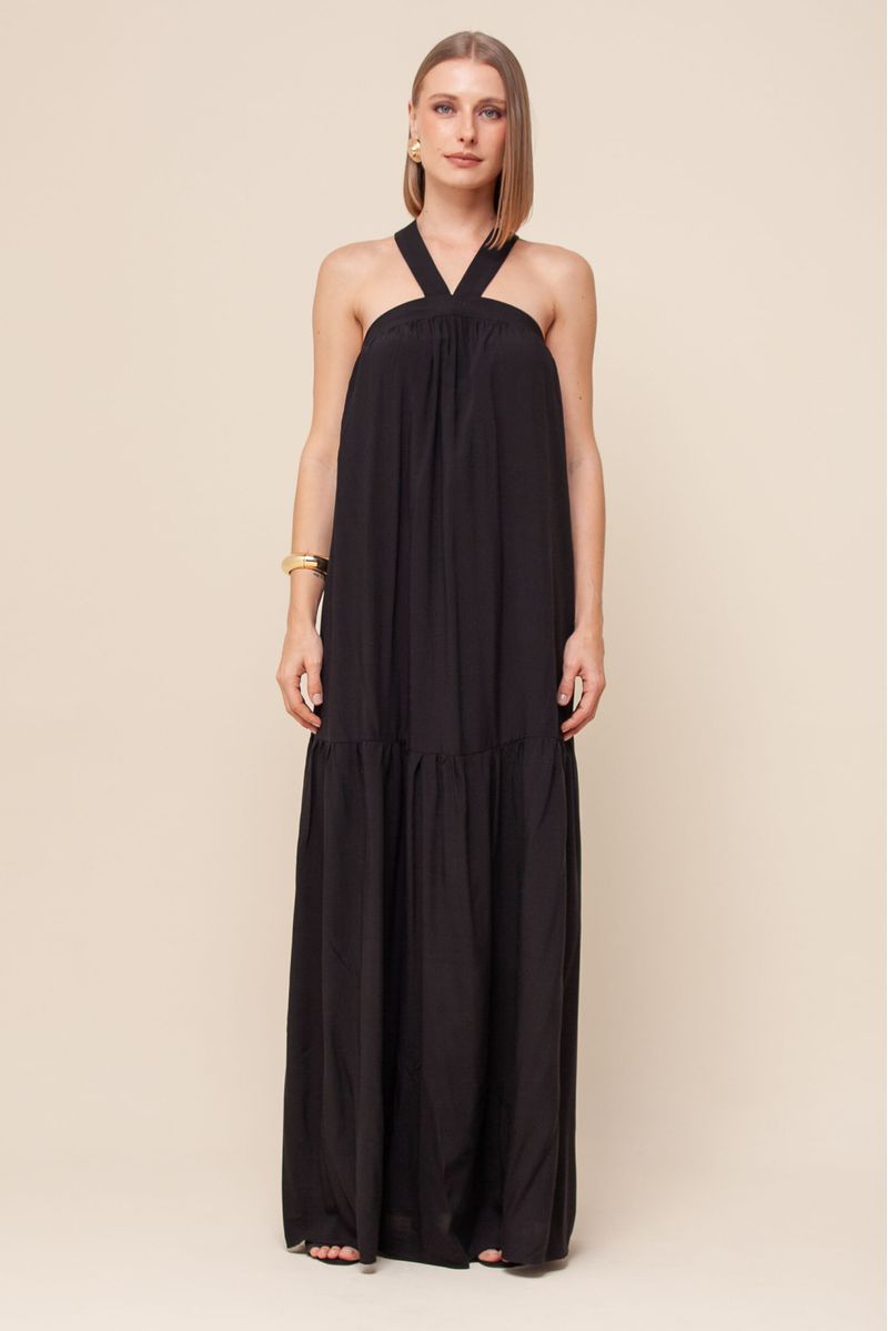 Vestido longo em viscose, comprimento com pregas que traz leveza e movimento à peça. As alças largas se cruzam nas costas, criando um decote elegante, enquanto o zíper invisível proporciona um ajuste perfeito.